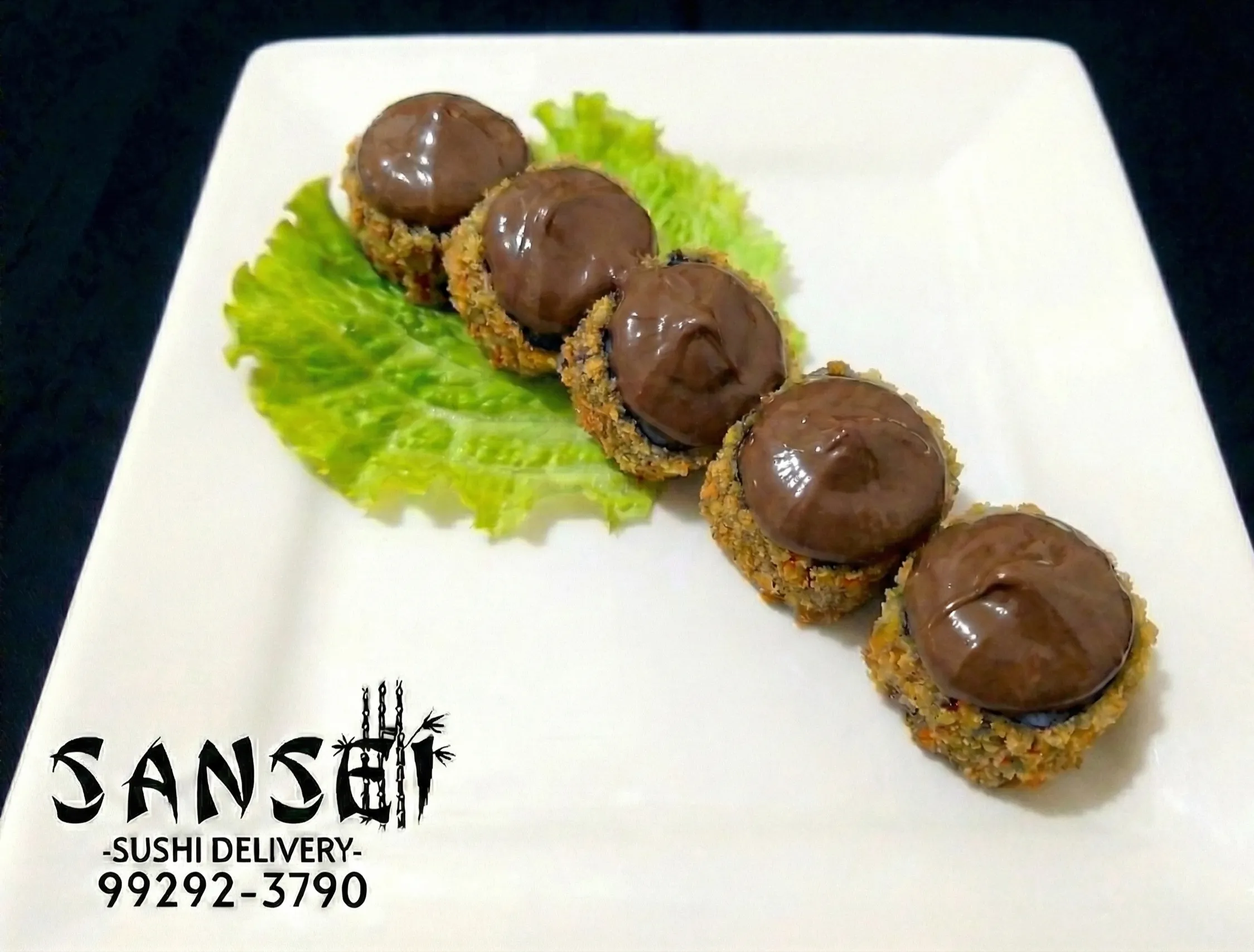 Enrolado com arroz por fora, recheio salmão, kani e cream cheese. Empanado com farinha panko e frito. Coberto com cebolinha, gergelim, molho tare e + cream cheese